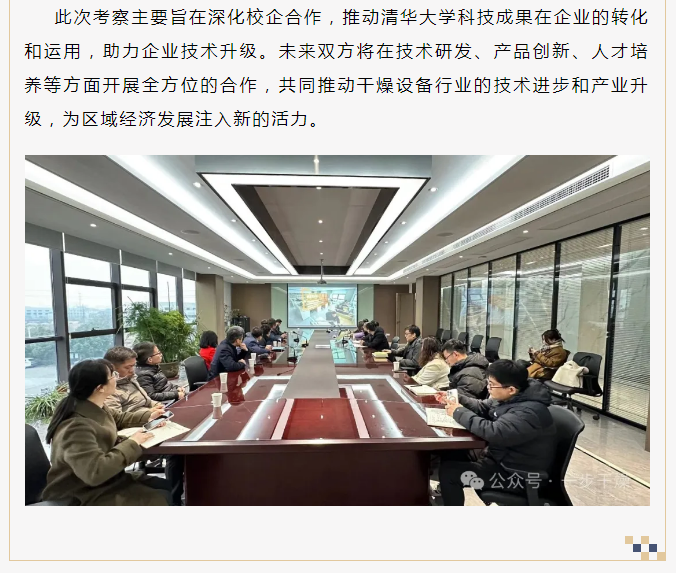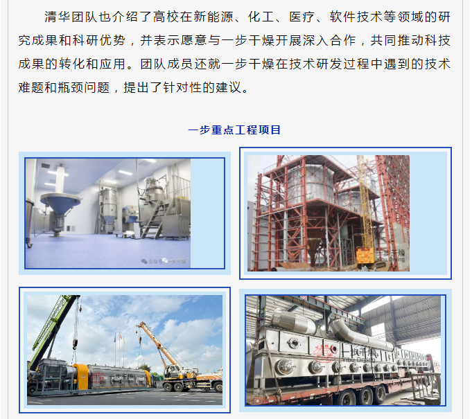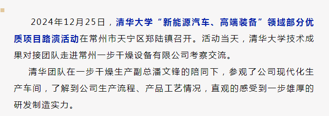 2024年12月25日,清华大学“新能源汽车、高端装备”领域部分优质项目路演活动在常州市天宁区郑陆镇召开。活动当天,清华大学技术成果对接团队走进常州一步干燥设备有限公司考察交流。清华团队在一步干燥生产副总潘文锋的陪同下,参观了公司现代化生产车间,了解到公司生产流程、产品工艺情况,直观的感受到一步雄厚的研发制造实力。