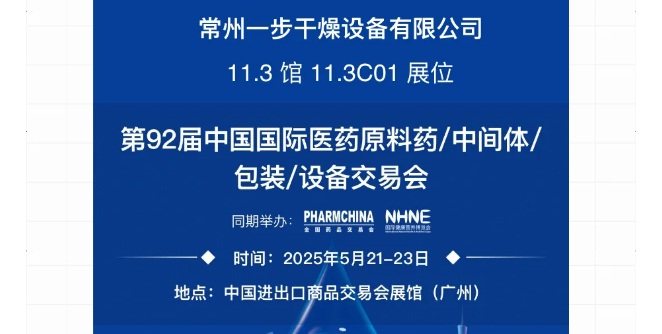 2025 年 5 月 21-23 日,第 92 届中国国际医药原料药 / 中间体 / 包装 / 设备交易会(API China)将在广州・中国进出口商品交易会展馆盛大举办。届时,常州一步干燥设备有限公司将携原料药干燥装备、固体制剂制粒干燥联线、中药配方颗粒智能化生产线等整体解决方案亮相本届展会。常州一步干燥设备有限公司诚邀您莅临 11.3 馆 11.3C01 展位,共探医药干燥领域新机遇!