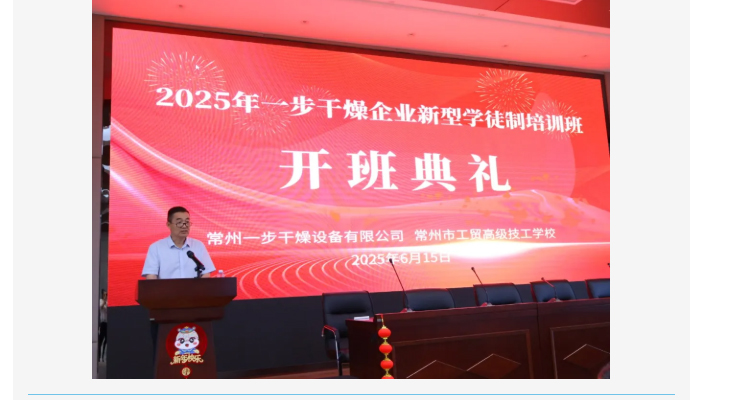 近日,“2025 年一步干燥企业新型学徒制培训班” 开班典礼暨安全生产月启动会议在公司五楼隆重举行。活动当天,常州市工贸高级技工学校党支部书记副校长王国俊亲临现场并发表讲话。王校长表示,企业新型学徒制是深化产教融合、校企合作,创新技能人才培养模式的重要措施。通过 “企校双师联合培养” 的方式,能够让学员们在听取专业老师讲解的理论知识与企业的实践操作中找到平衡点,快速成长为企业发展所需的高素质技能人才。这不仅为学员个人的职业发展铺就了道路,也为企业的长远发展注入活水。
