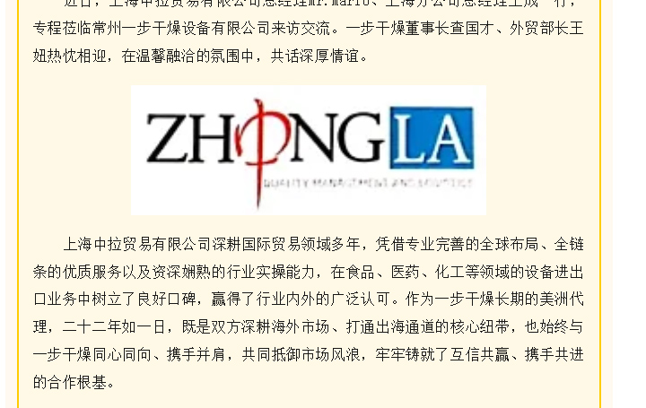 时光荏苒;岁月鎏金。近日,上海中拉贸易有限公司总经理Mr.Mario、上海分公司总经理王成一行,专程莅临常州一步干燥设备有限公司来…