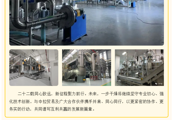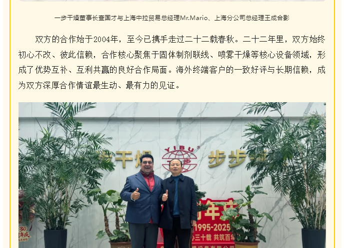 时光荏苒;岁月鎏金。近日,上海中拉贸易有限公司总经理Mr.Mario、上海分公司总经理王成一行,专程莅临常州一步干燥设备有限公司来访交流。一步干燥董事长查国才、外贸部长王妞热忱相迎,在温馨融洽的氛围中,共话深厚情谊。上海中拉贸易有限公司深耕国际贸易领域多年,凭借专业完善的全球布局、全链条的优质服务以及资深娴熟的行业实操能力,在食品、医药、化工等领域的设备进出口业务中树立了良好口碑,赢得了行业内外的广泛认可。