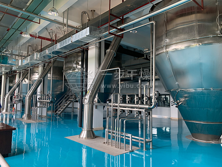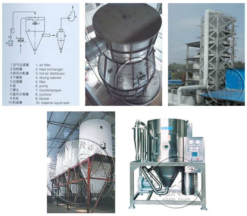 空气经过滤和加热,进入干燥器顶部空气分配器,热空气呈螺旋状均匀地进入干燥室。料液经塔体顶部的高速离心雾化器,(旋转)喷雾成极细微的雾状液珠,与热空气并流接触在极短的时间内可干燥为成品。成品连续地由干燥塔底部和旋风分离器中输出,废气由风机排空。
